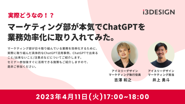 株式会社アイスリーデザイン(本社:東京都渋谷区、代表取締役:芝 陽一郎、以下:アイスリーデザイン)は、先日米OpenAIによって発表されたChatGPTに関するセミナー「実際どうなの!? マーケティング部が本気でChatGPTを業務効率化に取り入れてみた。」をテーマに2023年4月11日(火)17時よりオンラインセミナーを開催いたします。