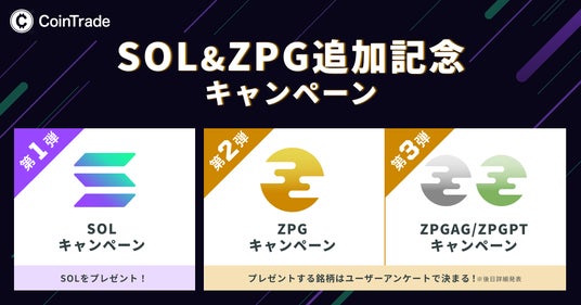 暗号資産運用サービス「CoinTradeStake(コイントレードステーク)」では、ソラナ(SOL)取り扱い開始により全11銘柄でステーキングサービスを提供することとなりました。 また、「CoinTrade(コイントレード)」はソラナ(SOL)、ジパングコイン(ZPG)、ジパングコインシルバー(ZPGAG)、ジパングコインプラチナ(ZPGPT)の4銘柄の取り扱い開始を記念して、第1弾から第3弾までの3つのキャンペーンを開催いたします。 キャンペーン対象期間 2024年3月28日(木)~2023年5月12日(日)
