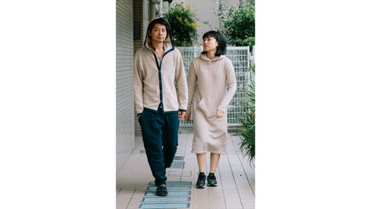 提供アイテム(左):もちはだ ルームウェア HAORI(ベージュ) ¥17,600/もちはだ ルームウェア PANTS(ネイビー) ¥17,600