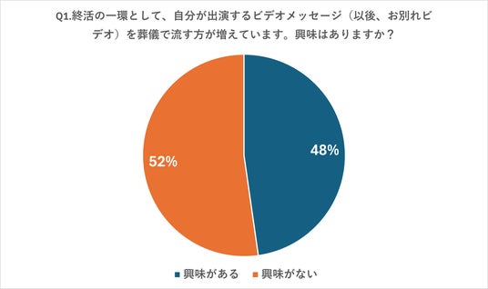Q1.終活の一環として、自分が出演するビデオメッセージ(以後、お別れビデオ)を葬儀で流す方が増えています。興味はありますか?