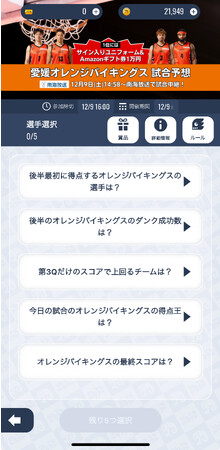 12月9日(土)の試合後半の展開を「なんドラ」で予想。通常の試合予想よりも多いTOP5までがギフト対象となり、さらに1位となった人には、Amazonギフト券1万円分+オレンジバイキングスの選手サイン入りオーセンティックユニフォーム(ホーム)と、いつもよりも豪華なギフトが用意されています。