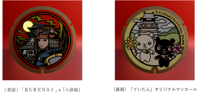 このNFTは、3Dマンホールが回転するアニメーションのアートワークで、表面には、大人気NFTコレクション「KURENAI」をモチーフに北九州市の観光名所「小倉城」をアレンジしたデザイン、裏面には、北九州市の環境マスコットキャラクター「ていたん」をモチーフにしたオリジナルマンホールのデザインを採用しています。