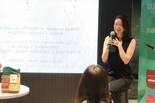 アスリートビューティーアドバイザー(R)️の花田 真寿美さんによるアスリートへのメイクメイク講座では、花田さん自身のキャリアを踏まえながら、アスリート時代を経てメイクとの出会いによる前向きな気持ちの変化を語っていただきました。