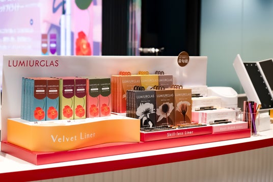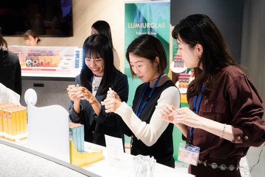 フロアのイベント会場にはルミアグラスの全商品をお試しできるタッチスペースを設置。イベントセッション終了後には、花田 真寿美さんからメイクのアドバイスや、来場者同士でのタッチアップなど、実際にルミアグラス全商品をお試しいただき、盛況の中終了となりました。