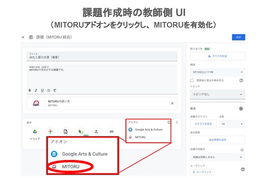 画像1:「MITORU」の Google Classroom アドオンを使用した、課題作成時の教師側UI。(※この画像は、イメージです。開発途中のため、今後変更の可能性があります)