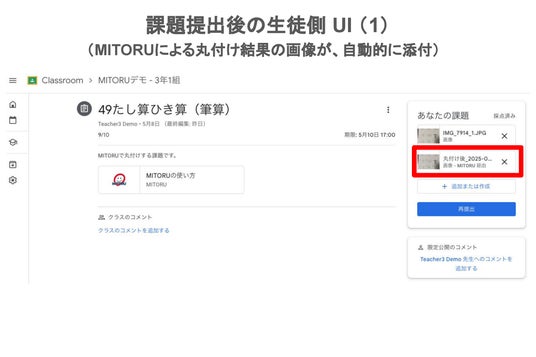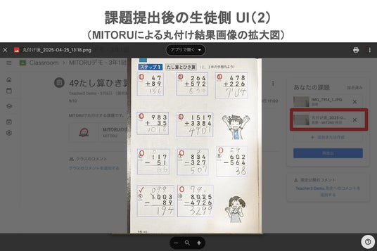 Google Classroom 上の課題提出機能を使い、児童自身で写真をアップロード。Google Classroom 上にアップロードされると同時に、「MITORU」が自動で丸付けを開始し、丸付け済みの画像を Google Classroom の画面上に表示。