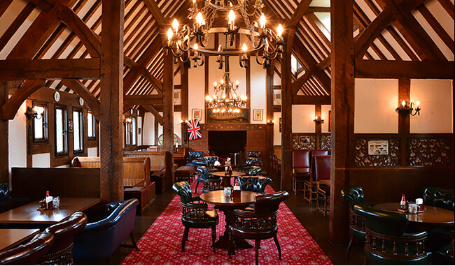 中世英国の街角にあるパブをそのままに再現した「フォルスタッフパブ」にて、季節ごとの旬の食材を使用した、シェフ特製メニューをお楽しみいただけます。ブリティッシュヒルズオリジナル・ブロンドエールや豊富な品揃えのウィスキーもぜひお試しください。