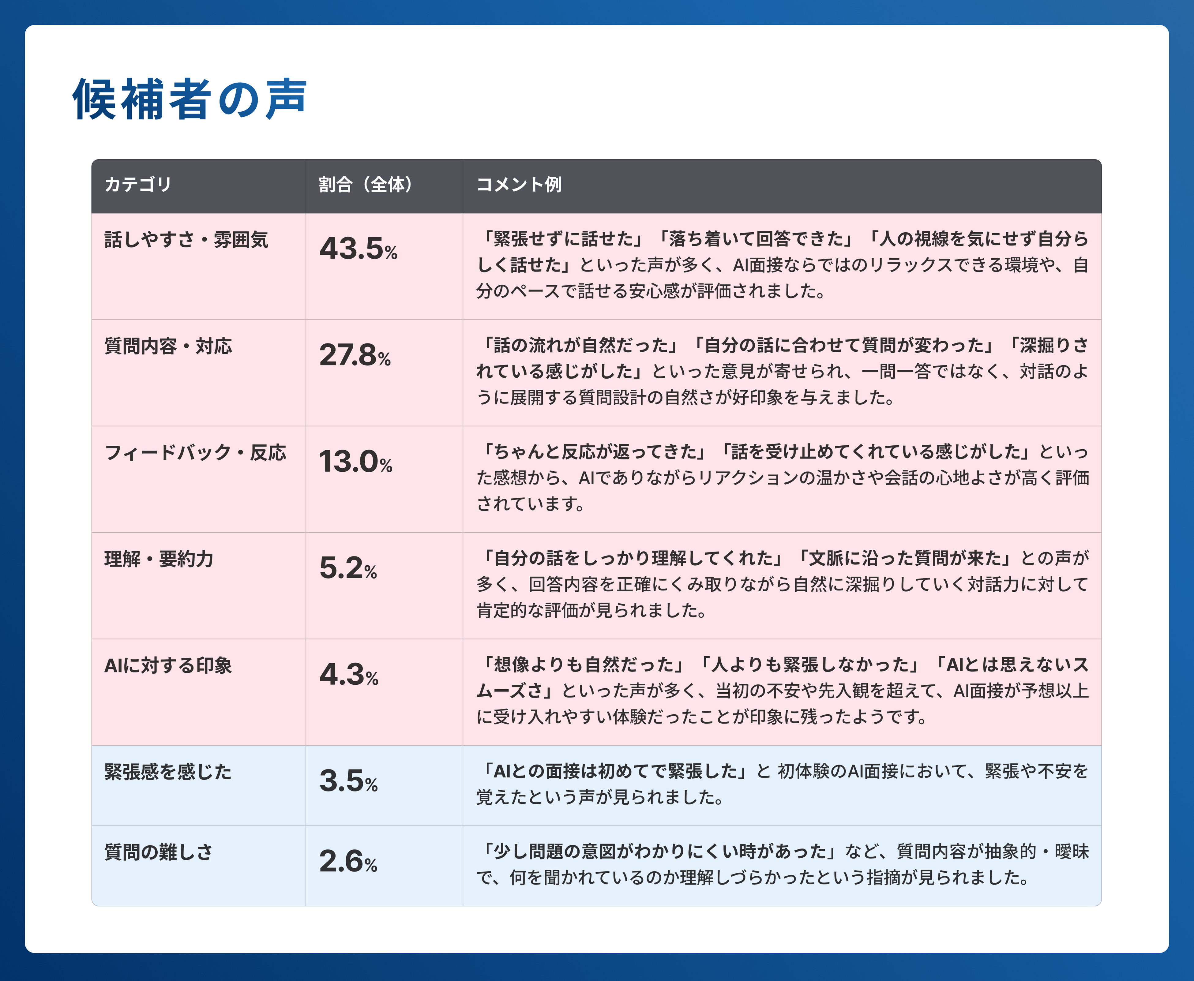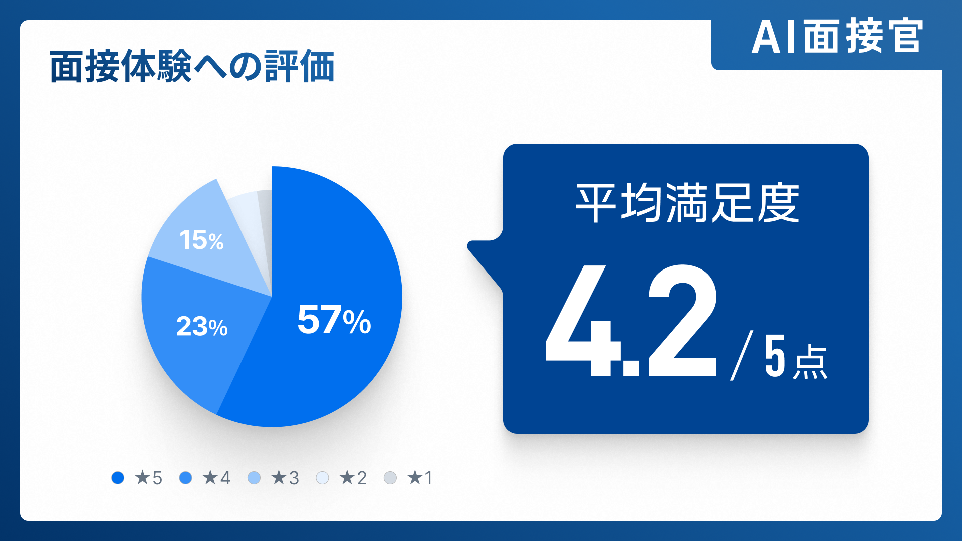 導入後の受検者アンケートでは、満足度平均4.2/5.0点という高い評価が得られ、「話しやすさ」「自然な対話」「公平な評価」などが特に支持を集めました。
