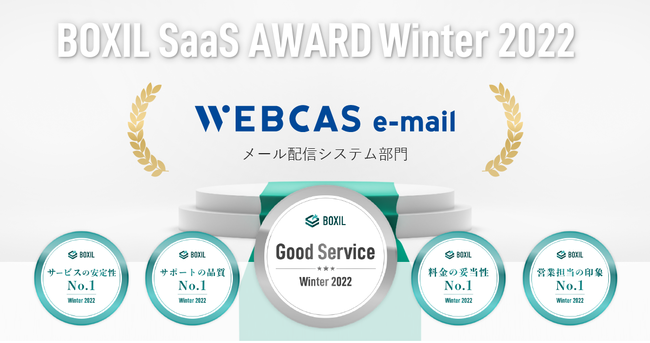 自社開発システム「WEBCAS(ウェブキャス)」と「WOW engage(ワオエンゲージ)」を通して、企業のマーケティングとカスタマーサクセスにおけるコミュニケーションの課題解決を支援する株式会社WOW WORLD(ワオワールド/本社:東京都品川区、代表取締役社長:美濃 和男、以下、WOW WORLD)は、スマートキャンプ株式会社(以下「スマートキャンプ」)が今最も評価されているSaaS(※)を表彰する「BOXIL SaaS AWARD Winter 2022」のメール配信システム部門において、当社の提供するメール配信システム「WEBCAS e-mail(ウェブキャス イーメール)」が「Good Service」に選出され、同時に「サービスの安定性No.1」「サポートの品質No.1」「料金の妥当性No.1」「営業担当の印象No.1」の4つのNo.1を獲得したことをお知らせいたします。