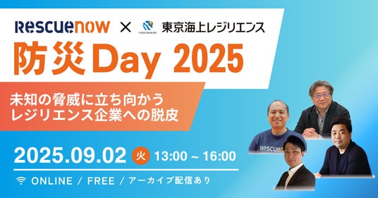 株式会社レスキューナウ(以下「レスキューナウ」)と東京海上レジリエンス株式会社(以下「東京海上レジリエンス」)は、2025年9月2日(火)に、「未来の脅威に立ち向かうレジリエンス企業への脱皮」をテーマに掲げたオンラインカンファレンス「レスキューナウ × 東京海上レジリエンス 防災Day 2025」を共同で開催いたします。