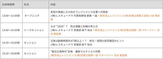 そこで「防災Day 2025」では、「未知の脅威に立ち向かうレジリエンス企業への脱皮」をテーマとして、危機管理の専門企業として法人の危機対応に20 年以上向き合ってきたレスキューナウと、「世の中から予期せぬ被災をなくしたい」をMISSION に掲げる東京海上レジリエンスが、実効性のある防災訓練、備蓄品の準備と管理、災害発生後の対応手順などについてカンファレンス形式でお話いたします。