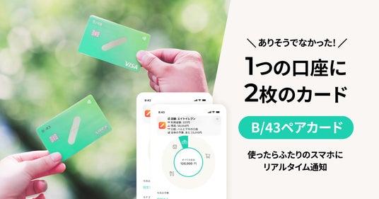 「B/43(ビーヨンサン)ペアカード」は、夫婦はもちろん、未婚や同棲カップルでも使えるチャージ式Visaカード&家計簿アプリのサービスです。毎月の予算をB/43ペアカードにチャージして、カードで支払うだけで、アプリに支出明細がリアルタイムで反映されます。1つの口座で2枚のカードが作れるので、面倒な割り勘や現金のやり取りが不要になり、ふたりで簡単に支出管理ができます。(サービスサイト:https://b43.jp/pair/)