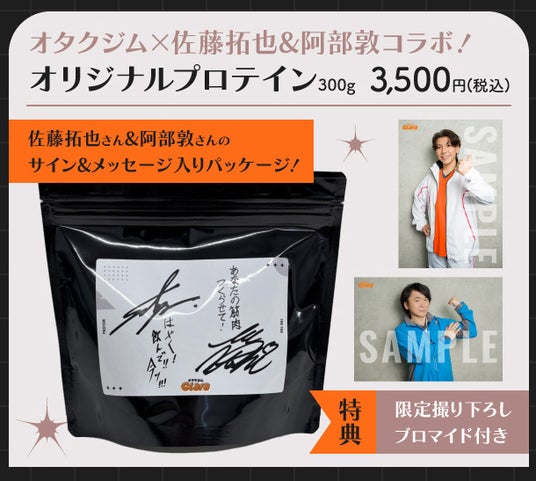 新規ご入会者様に佐藤拓也さん&阿部敦さんとのコラボプロテイン(限定プロマイド付き)をプレゼントいたします。