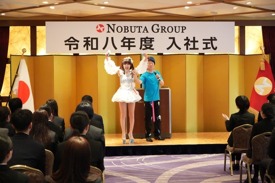 総合エンターテイメント事業を展開する株式会社 延田エンタープライズ(本社:大阪市中央区、代表取締役社長:延田尚弘、URL/ https://www.nobuta123.co.jp )は2026年4月1日(水)に挙行した入社式において、漫才コンビ「かつみ(ハート)︎さゆり」さんをサプライズゲストに迎えました。張り詰めた緊張感を一瞬で笑顔に変えた、当日の様子をご報告いたします。