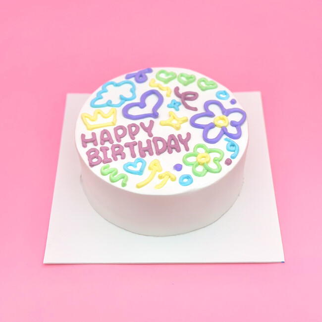 カラフルなクリームでハートやお花を描いたシンプルかわいいケーキです。