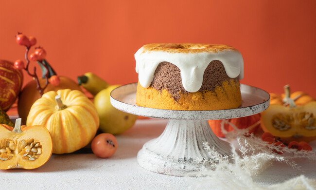 This is CHIFFON CAKE.の人気商品ブリュレシフォン「Brulee」をベースに、生地をココアとかぼちゃの二層にいたしました。