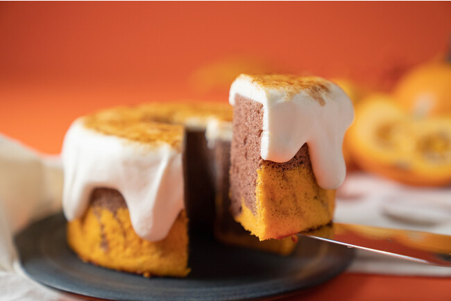生地側面を茶色とオレンジ色のマーブル模様にし、ハロウィンをイメージさせるシフォンケーキとなっています。