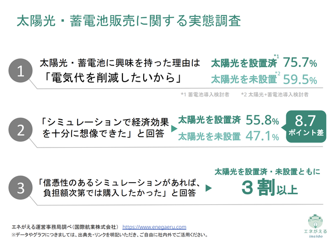 今回の調査では、太陽光・蓄電池の導入に対して関心度は高まっているものの、導入費用が高く、投資対効果が不明瞭なことから、導入を踏みとどまっており、営業時に信憑性の高いシミュレーションがされるかどうかが、導入におけるキーポイントになっていることが分かりました。シミュレーションでは「設備投資の回収期間」や「最適な電気料金プラン」を確認したいという声が多く、投資に対する回収の効果について明確に提示できるかどうかが最重要項目になっていると言えるでしょう。