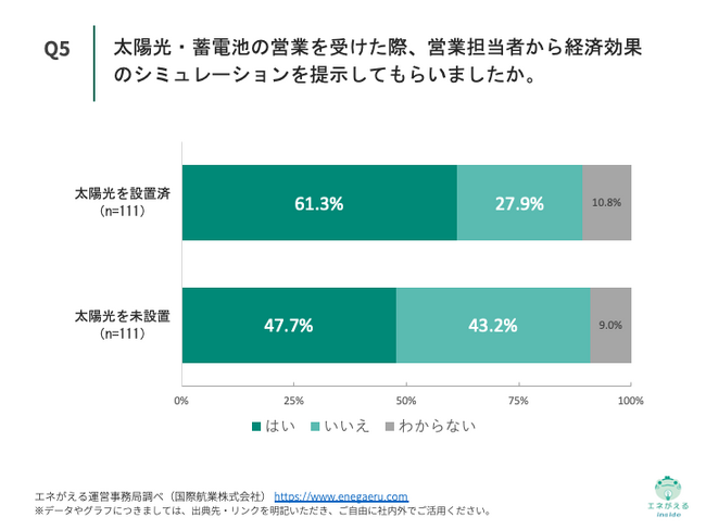 「Q5.太陽光・蓄電池の営業を受けた際、営業担当者から経済効果のシミュレーションを提示してもらいましたか。」と質問したところ、太陽光を設置済(n=111)は「はい」が61.3%、「いいえ」が27.9%、太陽光を未設置(n=111)は「はい」が47.7%、「いいえ」が43.2%という回答となりました。