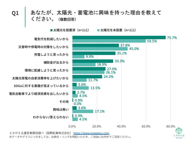 「Q1.あなたが、太陽光・蓄電池に興味を持った理由を教えてください。(複数回答)」と質問したところ、太陽光を設置済(n=111)は「電気代を削減したいから」が75.7%、「災害時や停電時の対策をしたいから」が37.8%、太陽光を未設置(n=111)は「電気代を削減したいから」が59.5%、「災害時や停電時の対策をしたいから」が45.0%、という回答となりました。