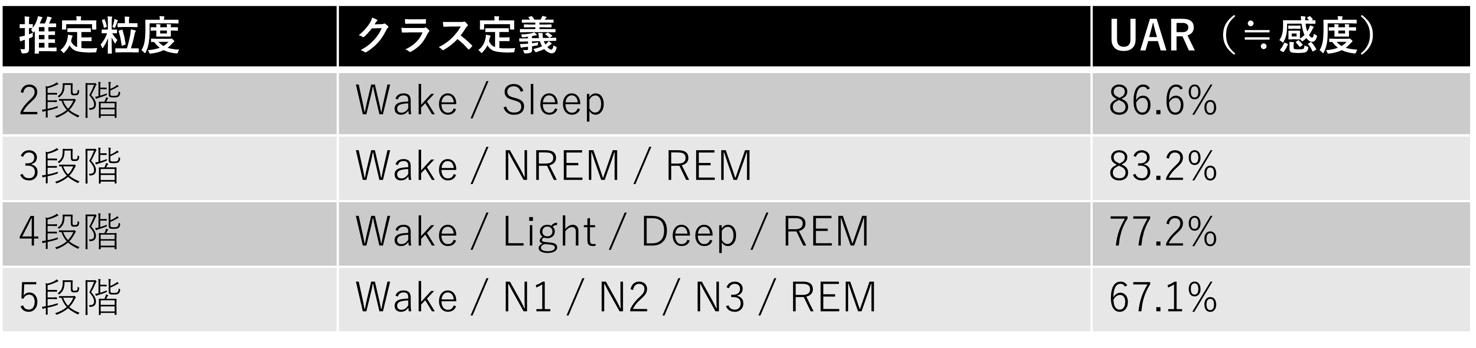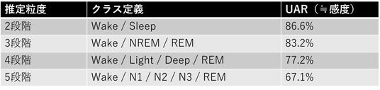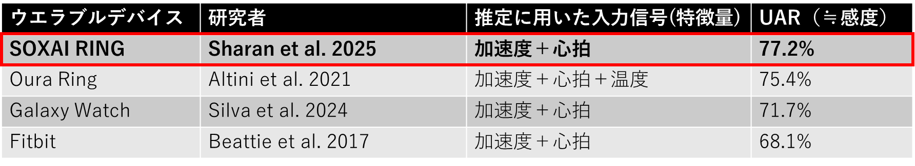 ※本研究では、5段階睡眠(Wake/N1/N2/N3/REM)についてもUARを報告しており、スマートリングデータでのより細かな睡眠ステージ推定に向けたベースラインを提示しています。