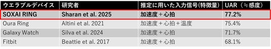 また、SOXAI RING 2では「Deep Sensing(TM)」の採用により、心拍数・心拍変動に関わる信号品質の向上を実現しています。本研究でも、心拍に体動情報を組み合わせることで精度が向上することが示されており、Deep Sensing(TM)による心拍精度の向上は、睡眠ステージ推定のさらなる改善に貢献するという設計思想のもと、プロダクトを進化させていきます。