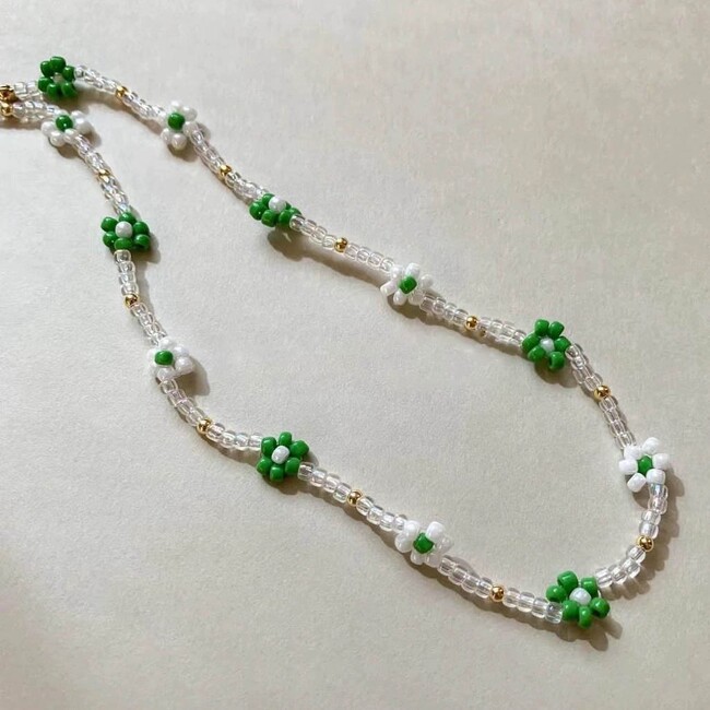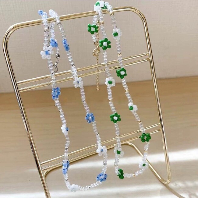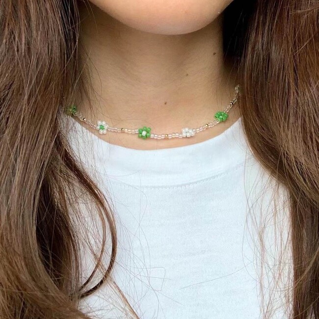並んだ小花がキュートなビーズネックレスです。透明感がオシャレで、夏らしい雰囲気をまといます。Tシャツなどのシンプルコーデにもぴったりのアイテムです。