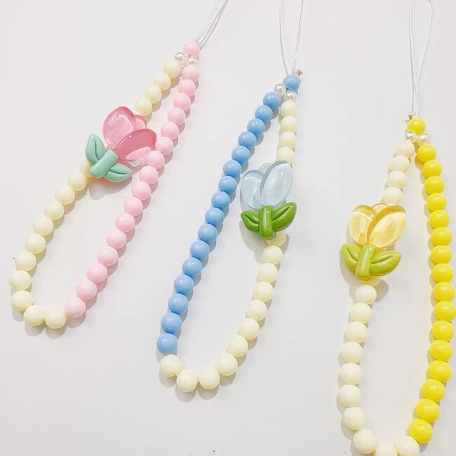 ぷっくりと存在感のあるチューリップがキュートなビーズストラップです。ビーズの2色使いがオシャレで、可愛さと大人っぽさのほどよいバランスを生み出しています。