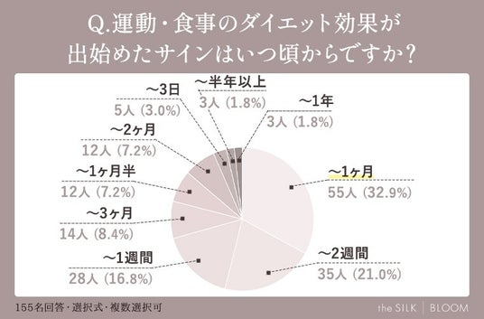 ダイエットの効果はすぐに現れるわけではなく、実際に155名にアンケート調査したところ「1ヶ月かかる」と答えた方が最も多い結果になりました!