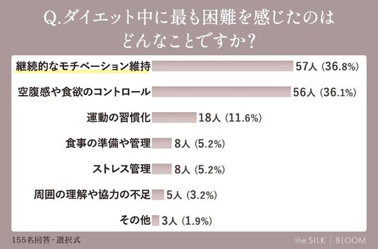 実際に155名の女性からも「ダイエット中のモチベーション維持が大変だった」という回答が多く見られました。