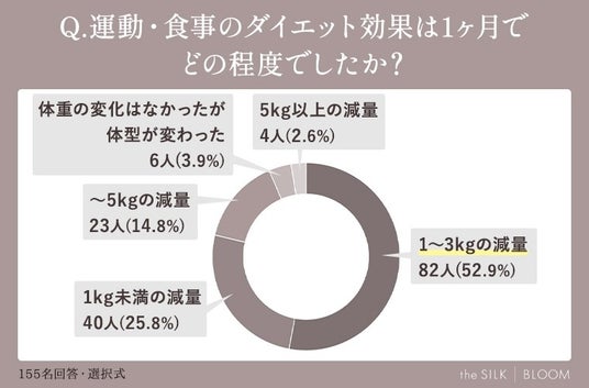 1ヶ月でどのくらいの減量効果があったのか、155名に調査したところ最も多かった回答は「1ヶ月で1-3kgの減量」で52.9%でした!