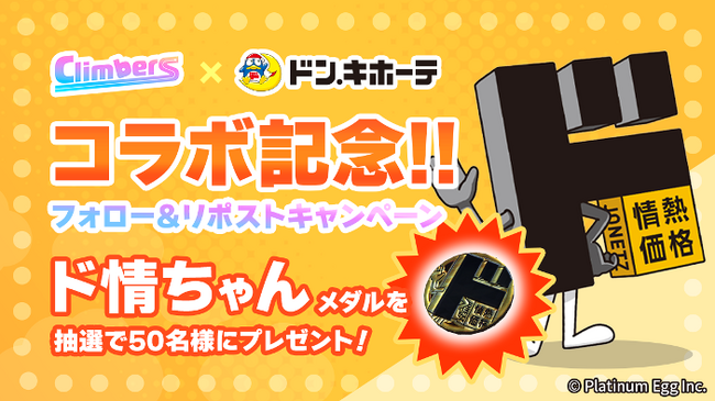 ブロックチェーンゲーム、NFT開発を手掛ける株式会社プラチナエッグ(本社:東京都文京区本郷、代表取締役:竹村也哉)は、賞金付きバトルロイヤルレース「クライマーズ(Climbers)」と総合ディスカウントストア「ドン・キホーテ」とのコラボイベントを2024年1月23日より開始したことを発表いたします。