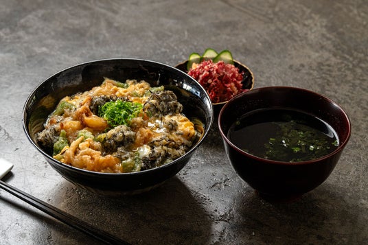 「元祖 海藻天とじ丼」では、すじ青のり天ぷら、スーナ入り玉ねぎかき揚げ、若ひじき天ぷらなどを丼にしました。小鉢、お吸い物をつけてご提供いたします。