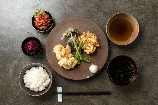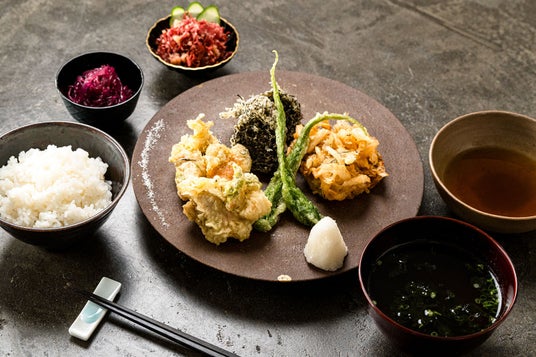 揚げても美味しい海藻の魅力を存分に味わっていただくために、「元祖 海藻天ぷら御膳」には、5種の天ぷら(すじ青のり天ぷら・あつばアオサ天ぷら・若ひじき天ぷら・スーナ入り玉ねぎかき揚げ・かしわ天ぷら)と、小鉢、ご飯、お吸い物をつけてご提供いたします。