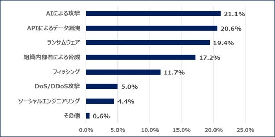 サイバー攻撃のリスクについて、最もセキュリティリスクが高いと思うものは、「AIによる攻撃」が21.1%と最も多く、次に「APIによるデータ漏洩」(20.6%)、「ランサムウェア」(19.4%)と続く。一方で、「DoS/DDoS攻撃」(5.0%)、「ソーシャルエンジニアリング」(4.4%)は5%以下にとどまった。