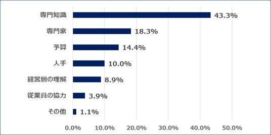 サイバーセキュリティを推進するにあたり、最も必要だと思うものは、「専門知識」が43.3%で最も多く、次に「専門家」(18.3%)、「予算」(14.4%)と続く。日本企業で「情報セキュリティ」業務に携わる人の多くが、サイバーセキュリティに関する専門的な知識やスキル・技術が必要だと認識していることがうかがえる。