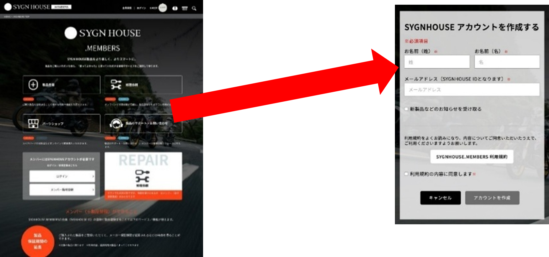 本サービスでは、製品登録、修理依頼、パーツショップ、製品のサポート・お問い合わせの4つのコンテンツを提供します。URLは、https://members.sygnhouse.jp/ です。