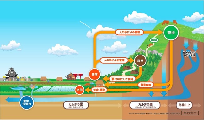 「阿蘇」の壮大な景観は、日本の伝統的な土地利用である「草地―森林―集落―水田」が、カルデラ全域に広がることにより形成されています。「野焼き・放牧・採草」の草地管理システムに基づいた人々の営みにより、千年以上にわたって半自然草地が維持され続けてきました。