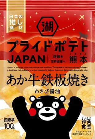 第3弾となる今回は、平成30年(2018年)に国の「地理的表示(GI)保護制度※」にも登録された和牛“くまもとあか牛”を「日本の推し食材」として初めて使用した、「湖池屋プライドポテト JAPAN あか牛鉄板焼き わさび醤油 熊本」を、7月31日から、全国で販売スタートしました。“くまもとあか牛”は、放牧に適した牛として誕生した品種であり、世界文化遺産登録を目指す阿蘇の美しい草原を維持するために欠かせない存在です。本商品で“くまもとあか牛”を使用することで畜産業を振興し、阿蘇の草原維持に貢献したいという企業の思いが込められています。