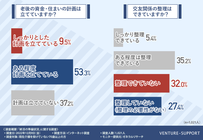 ベンチャーサポート相続税理士法人 (東京都中央区 代表税理士 古尾谷裕昭 https://vs-group.jp/sozokuzei/supportcenter/)は、「終活の準備状況」に関する実態調査を実施しましたので、お知らせいたします。