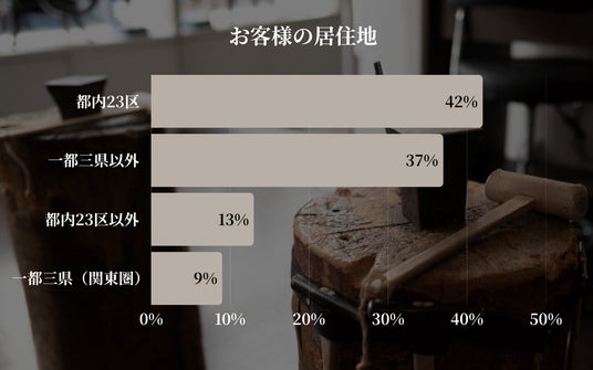 都内23区在住の顧客が最も多く、全体の42%を占めています。一方で、一都三県以外からの顧客も37%と高い割合を示しており、地方からも一定数の集客があることが分かります。都内23区以外や関東圏内(一都三県)の割合は比較的低い結果でした。
