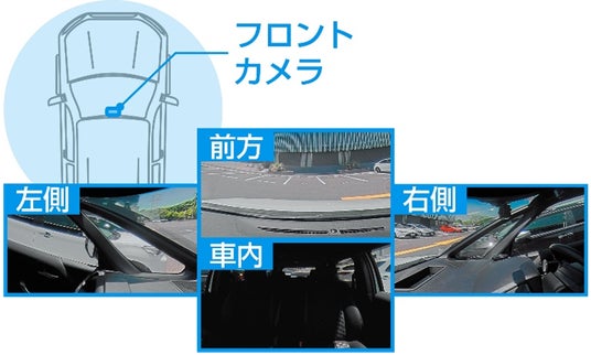 フロントには360°カメラを採用。前方の映像だけでなく、側方・車内の映像も記録可能。