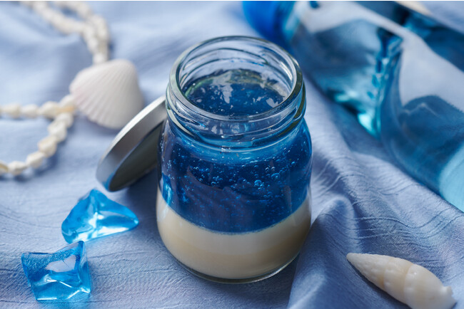 なめらかなプリンの上に深海を表現したブルーのジュレはラムネ味と