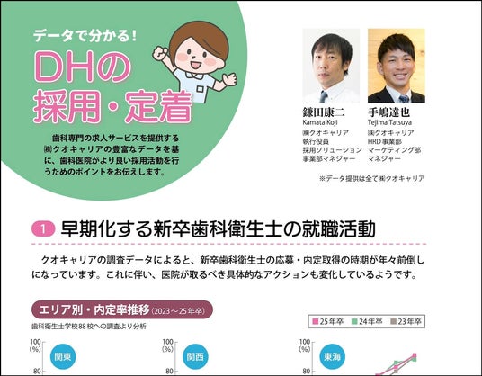 クオキャリアが独自に行った歯科衛生士養成校への調査データの分析結果などを紹介するとともに、新卒歯科衛生士の就職活動が早期化する中で求人歯科医院がとるべきアクションについても解説しています。