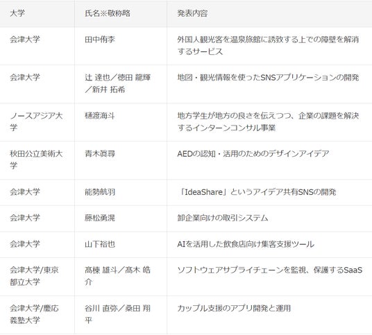 イベント当日は、会津・秋田地方の大学に所属している学生総勢18名(9組)が参加。各々が計画した事業のプレゼンテーションに臨みました。会津大学所属の山下 裕也さんは「AIを活用した飲食店向け集客支援ツール」の事業内容を発表。山下さんは「これまではエンジニアとして個人での活動がメインでした。しかし、今回のアオタケプロジェクトを通じて事業オーナーという意識が強くなりました。自分でできないことは、アウトソーシングでその領域に長ける方を仲間にし、チームで事業を遂行していく。その重要性を認識することができたと共に、今回私が最も成長できたことでした。また、メンターさんからは、ゴールから逆算してマイルストーンを設定し、一つずつ着実に目標に向け動いていくという事業を遂行するためのフローも学ぶことができました」と本プロジェクトを通じて得た成長や学びについてコメントされました。