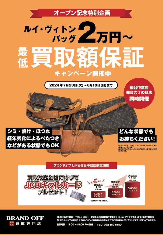 地域のお客様に愛されるブランド買取店を目指し、7/23にオープンいたしました。お客様一人ひとりに寄り添い、丁寧な査定と高価買取を実現いたします。ブランド買取LIFEと併せ幅広い商材の買取に対応しておりますので、仙台近郊にお住まいのお客様はぜひご来店くださいませ。