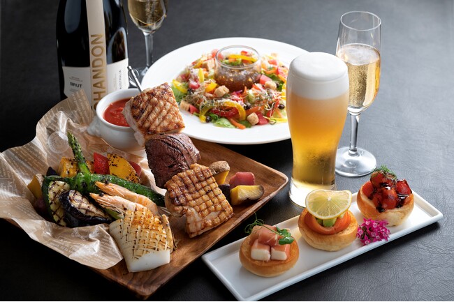 スパークリングワイン「CHANDON」や生ビール(キリン一番搾り)など充実したドリンクのラインナップに加え、彩り野菜のカラフルサラダや3種のブルスケッタ、お肉料理などお料理もオシャレに、ご満足いただける内容でご提供いたします。