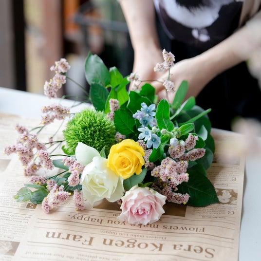 お好きなばらを選んでフローリスト、サウザー愛子さんが素敵な花束にアレンジ。自分で作るアレンジメント体験もあります。事前予約制で花束を予約できる「サプライズブーケ」もあります。大切な方へのプレゼントに。
