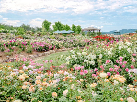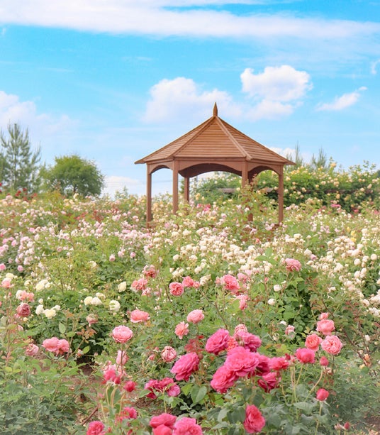 約50品種のイングリッシュローズを植栽した見本園。色・花形・香・花びら・葉など、様々な違いを見つけながら、ひとつひとつのイングリッシュローズをお楽しみください。ガゼボと一緒に写真を撮るのもおすすめです。