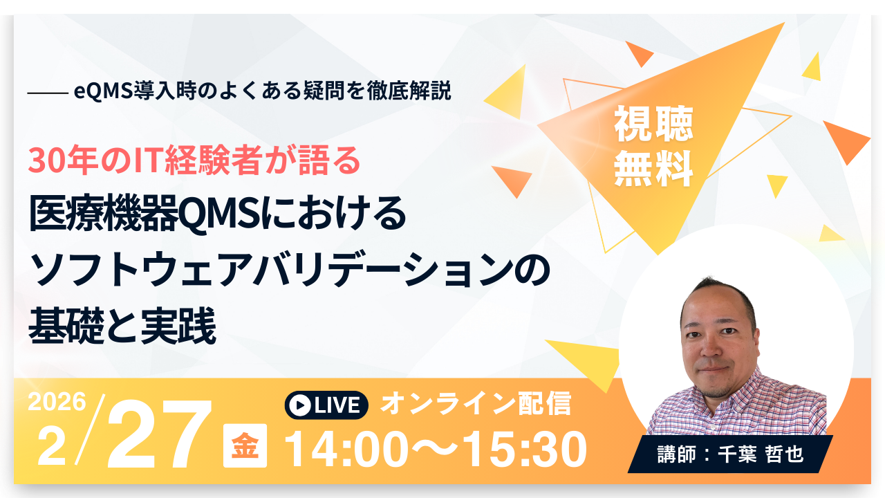 株式会社Berry(本社:東京都台東区、代表取締役:中野裕士)は、医療機器QMSにおけるソフトウェアバリデーション(CSV)の基礎から実践までを解説する無料オンラインセミナー「【30年のIT経験者が語る】医療機器QMSにおけるソフトウェアバリデーションの基礎と実践 ~eQMS導入時のよくある疑問を徹底解説~」を、2026年2月27日(金)に開催します。